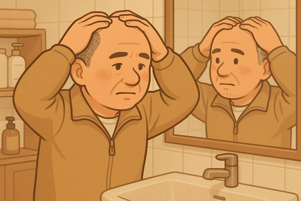 排水口に溜まった抜け毛、こめかみに広がる白髪。